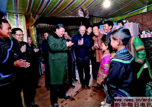 ▲这是2月11日上午,习近平在凉山彝族自治州昭觉县三岔河乡三河村贫困户吉好也求家中看望,听10岁小女孩吉好有果唱《国旗国旗真美丽》。