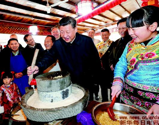 ▲这是2月12日上午,习近平在阿坝藏族羌族自治州汶川县映秀镇考察时同居民群众一起磨豆花。