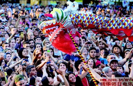 ▲2月10日,在阿根廷布宜诺斯艾利斯举行的中国春节庙会上,观众拍摄舞龙画面。
