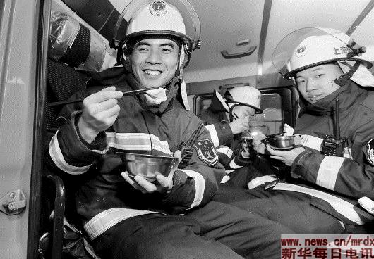 ▲2月15日,上海市长宁区公安消防支队天山中队的上等兵王永兵(左一)和战友们在值班消防车内吃饺子。