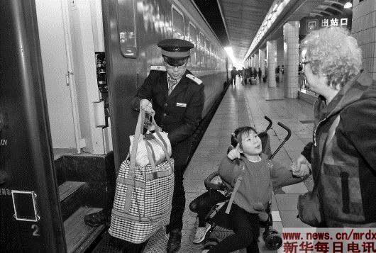 ▲2月18日,Z99次列车的列车员在帮助旅客搬运行李。