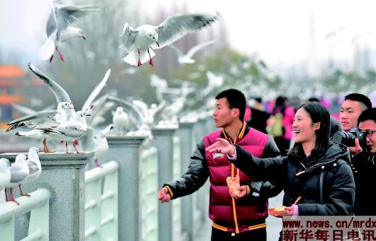 ▲游客在云南省昆明市滇池边给越冬的红嘴鸥喂食。新华社记者蔺以光摄