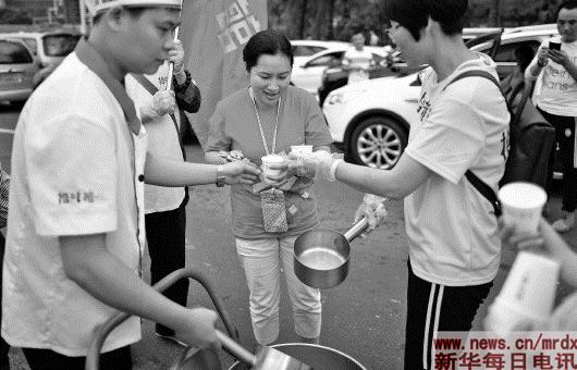 “老人家,喝杯热水暖暖身子,请耐心等待,大雾散去了就能回家了。”19日晚,海口天利龙腾湾小区的20多名业主自发组队,他们提着热水壶穿梭于车辆间,为滞留在滨海大道的旅客送上一杯杯热水。在海口滨海大道福隆广场路边,秦先生全家出动为滞留旅客免费派送自制绿豆汤,20日共派送14锅绿豆汤。