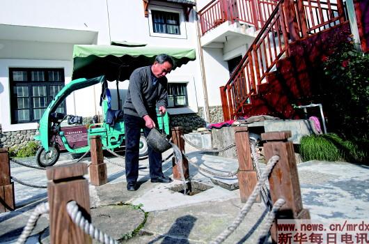 ▲下姜村村民姜祖海在自家门口为沼气池添水(1月10日摄)。新华社记者翁忻旸摄