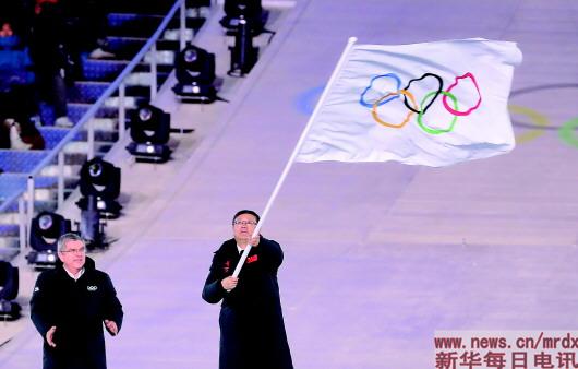 2月25日,北京市市长陈吉宁(右)在闭幕式上挥动奥林匹克会旗。