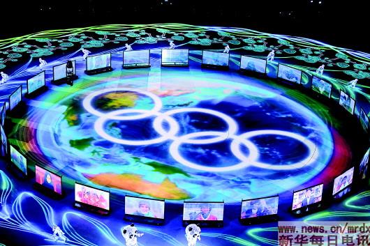 当24个机器人渐渐围成一个圆,蔚蓝的地球出现在舞台中央,五大洲儿童的欢快笑脸映衬着和谐世界。多维互动下,代表欢庆的彩带,象征和平的橄榄枝,高尚纯洁的梅花以及紧紧相连的奥运五环……体现出中国推动构建人类命运共同体,推动世界和平,共建更加美好世界的愿景。