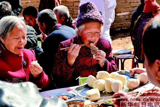 冯文忠的母亲贾金梅(右)在婚宴上吃饭。
