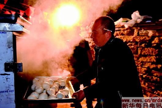 | 为婚礼帮厨的村民在蒸馒头。 |