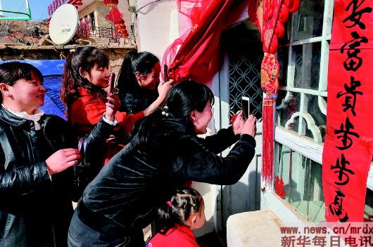 | 村民们围在婚房门口拍摄新郎和新娘。