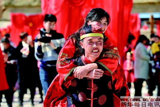 | 新郎冯文忠背着新娘刘翠翠走回家中。