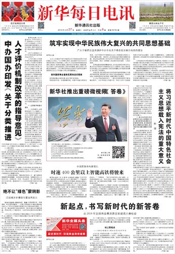 ( 2018-02-27 ) 稿件来源: 新华每日电讯头版新闻