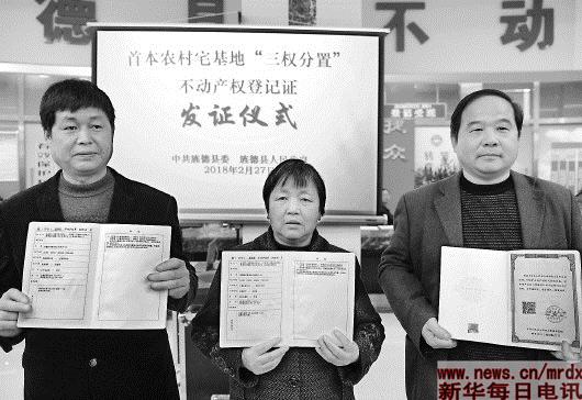 2月27日,宅基地使用权人王五四(左)、宅基地资格权人方圣莲(中)、宅基地所有权人——旌德县兴隆镇大礼村民委员会的代表孙秀宝在展示领到的首本农村宅基地“三权分置”不动产权登记证。 |