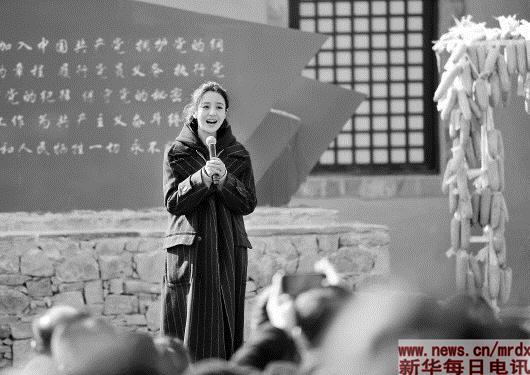 2月1日,演员佟丽娅为群众演唱歌曲《一对对鸳鸯水上漂》。当日,“我们的中国梦——文化进万家”文化文艺小分队来到陕西省铜川市耀州区慰问演出,艺术家们用精彩的演出为革命老区的群众带来精神盛宴。