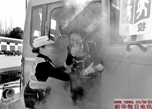 ▲2月27日,交警在指导上海世界外国语小学学生从“起火”的校车中紧急疏散。