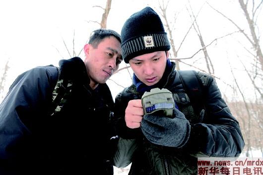1月17日,张鑫(右)和陈建在林区巡护过程中查看一处远红外相机拍摄的资料。