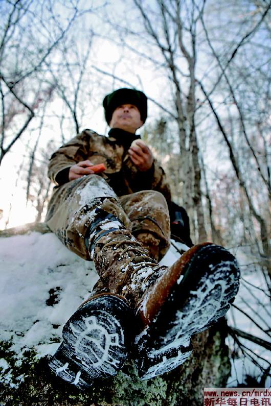 梁奉恩在保护区内巡护时常常自备干粮,到了午饭时间就这样随处找一个石头就地随便吃一口(1月18日摄)。