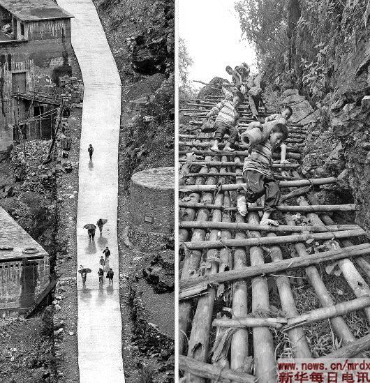 ▲2012年9月3日,广西大化瑶族自治县板升乡弄勇村弄顶屯的孩子们扛着生活用具去学校(右图);2017年1月11日,水泥公路已经从学校修通到家门口(左图)。随着脱贫攻坚工作不断推进,原本“千重山,万层岭,不通水,不通电”的广西大石山区发生了翻天覆地的变化。
