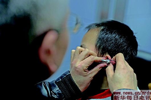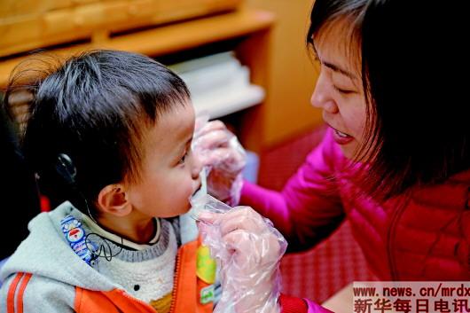 2月28日,老师为午睡起床的听障儿童戴好人工耳蜗。 |