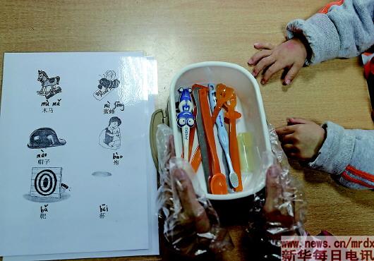 2月28日,对于低龄和极重度听障儿童,老师要进行“一对一”语言训练课程,这是上课所用的字词表和压舌板等教具。 |