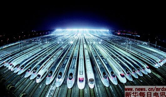 ▲动车组停靠在武汉动车段的存车线上,准备进行检修和保温作业(2月1日摄)。
