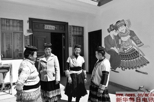 ▲2月17日,云南寻甸回族彝族自治县功山镇偏路村的几名苗族妇女在新居前聊天。