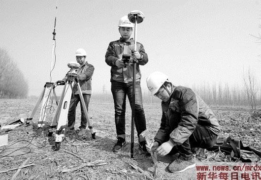 ▲3月2日,在河北霸州,中铁上海工程局集团京雄城际铁路五标项目部工作人员进行坐标放样。北京至雄安城际铁路是雄安新区首个重大交通项目,正线全长92.4公里,共设5座车站,总投资约335.3亿元,全线将于2020年底投入使用。