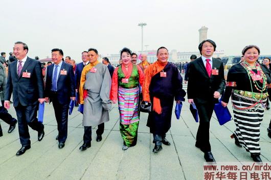 “我们坚决拥护以习近平同志为核心的中共中央,要以习近平新时代中国特色社会主义思想为指引,履职尽责有新作为。”来自云南的白族委员杨宁、纳西族委员和向红身着鲜艳的民族服装,边上台阶边交流。