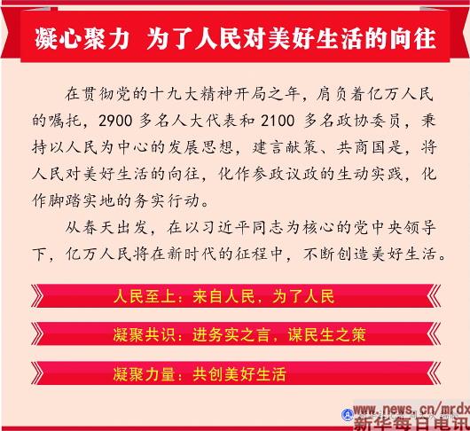 在贯彻党的十九大精神开局之年,肩负着亿万人民的嘱托,2900多名人大代表和2100多名政协委员,秉持以人民为中心的发展思想,建言献策、共商国是,将人民对美好生活的向往,化作参政议政的生动实践,化作脚踏实地的务实行动。