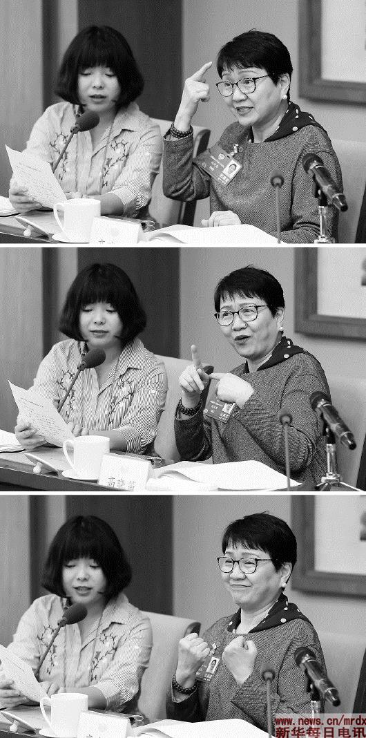 3月4日,在全国政协十三届一次会议社会福利和社会保障界分组会上,全国政协委员高晓笛在手语翻译何阳的帮助下,既能“听到”其他委员的发言,也能“说出”自己的所思所想(拼版照片)。新华社记者沈伯韩摄 |