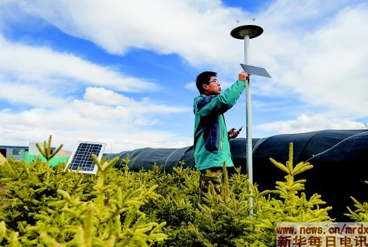 “那曲高寒地区植树重大科技攻关项目”试验基地绿化工程师何亚锐在苗圃基地内查看气象站大数据自动监测设备,并用手机端采集气象数据(3月2日摄)。试验基地占地1000亩,位于那曲地区那曲县境内。该项目技术人员研究树木对高海拔环境的适应性问题,同时开展试种工作,以攻克高寒地区树木成活率低这一难题。目前,高寒植树试验等各项工作进展顺利。  新华社记者刘东君摄