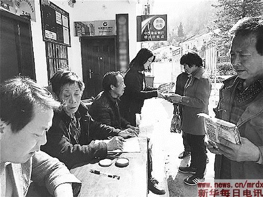 | 建设银行驻村干部在“善融商务”精准扶贫点三柳村向贫困户免费发放优质谷种。 |