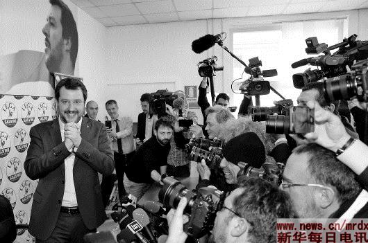▲3月5日,在意大利米兰,联盟党领导人马泰奥·萨尔维尼(左一)出席新闻发布会。持民粹主义立场的联盟党在参众两院选举中分别以17.64%和17.39%的得票率超过前总理贝卢斯科尼领导的意大利力量党,成为中右翼联盟的主力。据意大利内政部网站5日公布的议会选举结果,中右翼联盟在4日举行的参众两院选举中分别赢得不低于37%的选票,得票率第一。新华社发
