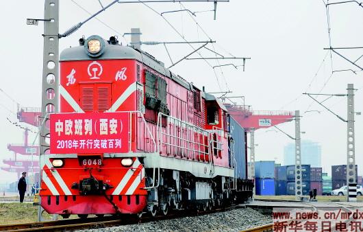 3月7日,开往德国汉堡的X8001次中欧班列从西安新筑车站驶出。2018年陕西中欧班列开行突破100列大关。新华社记者李一博摄