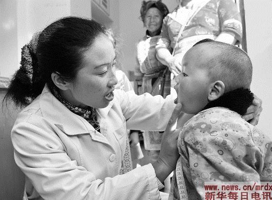 ▲杨莲英代表在村医务室为儿童检查身体(2月24日摄)。新华社记者杨宗友摄