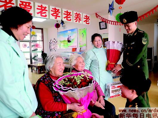 3月7日,龙王庙边防派出所官兵给老人送来食品和鲜花。当日,大连公安边防支队龙王庙边防派出所官兵到辖区内的阳光花园敬老院慰问,给老人送来食品和鲜花,献上节日祝福。