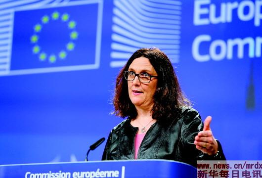 | ▲3月7日,在比利时布鲁塞尔欧盟总部,欧盟贸易委员马尔姆斯特伦出席新闻发布会。欧盟委员会在7日的例行会议后宣布,当天的会议讨论并通过了一份针对美国加征钢铝关税出台反制措施的提案。新华社记者叶平凡摄