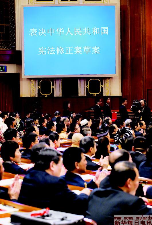 王晨宣布:《中华人民共和国宪法修正案》通过。会场顿时响起热烈的掌声。