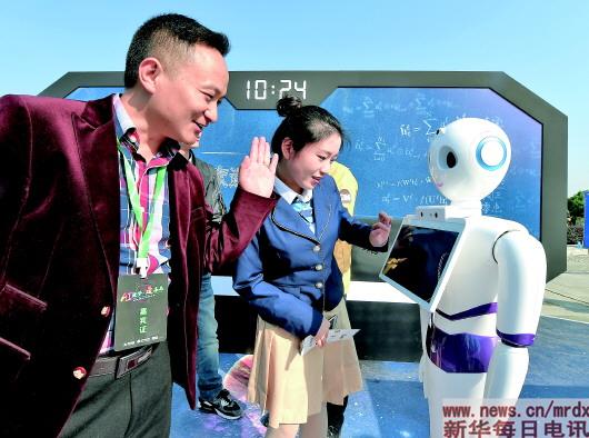 在安徽合肥开幕的科大讯飞(首届)全球1024开发者节展示区内,参观者和智能语音机器人进行互动(2017年10月24日摄)。