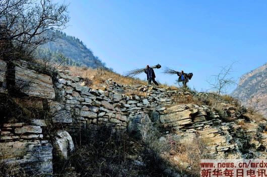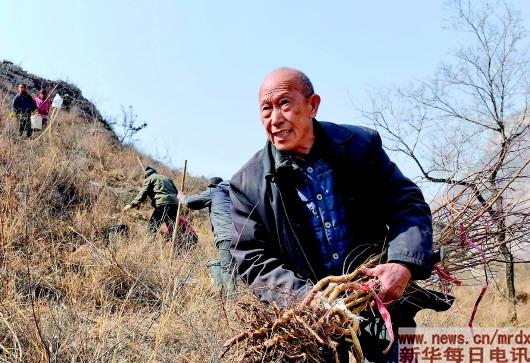 3月9日,在邢台县太子井乡峰门村一带的山场,郝景香和造林队员在运送树苗。