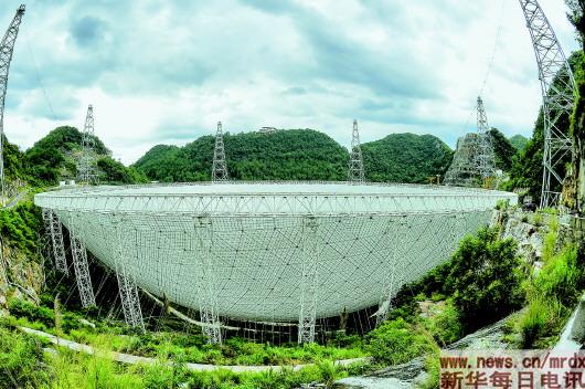 ▲这是群山之中的500米口径球面射电望远镜(FAST)全景(2017年8月9日摄)。