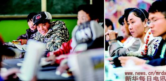 左图:孩子们在西藏山南市浪卡子县普玛江塘小学上课(2017年3月10日摄)。