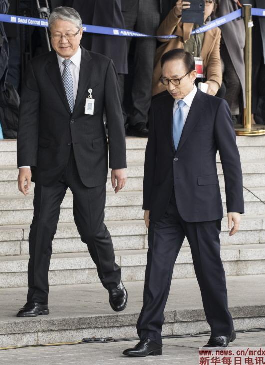 3月14日,韩国前总统李明博(右)抵达韩国首尔中央地方检察厅。李明博因涉嫌贪腐和滥用职权等罪名于14日首次接受检方讯问,他向公众致歉但否认所涉罪名。