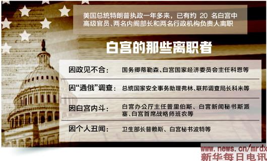 新华社华盛顿3月14日电(记者徐剑梅、刘阳)再过一周,美国总统特朗普执政届满14个月。一年多来,已有约20名白宫中高级官员、两名内阁部长和两名行政机构负责人离职。其中包括总统国家安全事务助理弗林、白宫办公厅主任普里伯斯、白宫新闻秘书斯派塞、白宫首席战略师班农、白宫国家经济委员会主任科恩、联邦调查局长科米、国务卿蒂勒森等。
