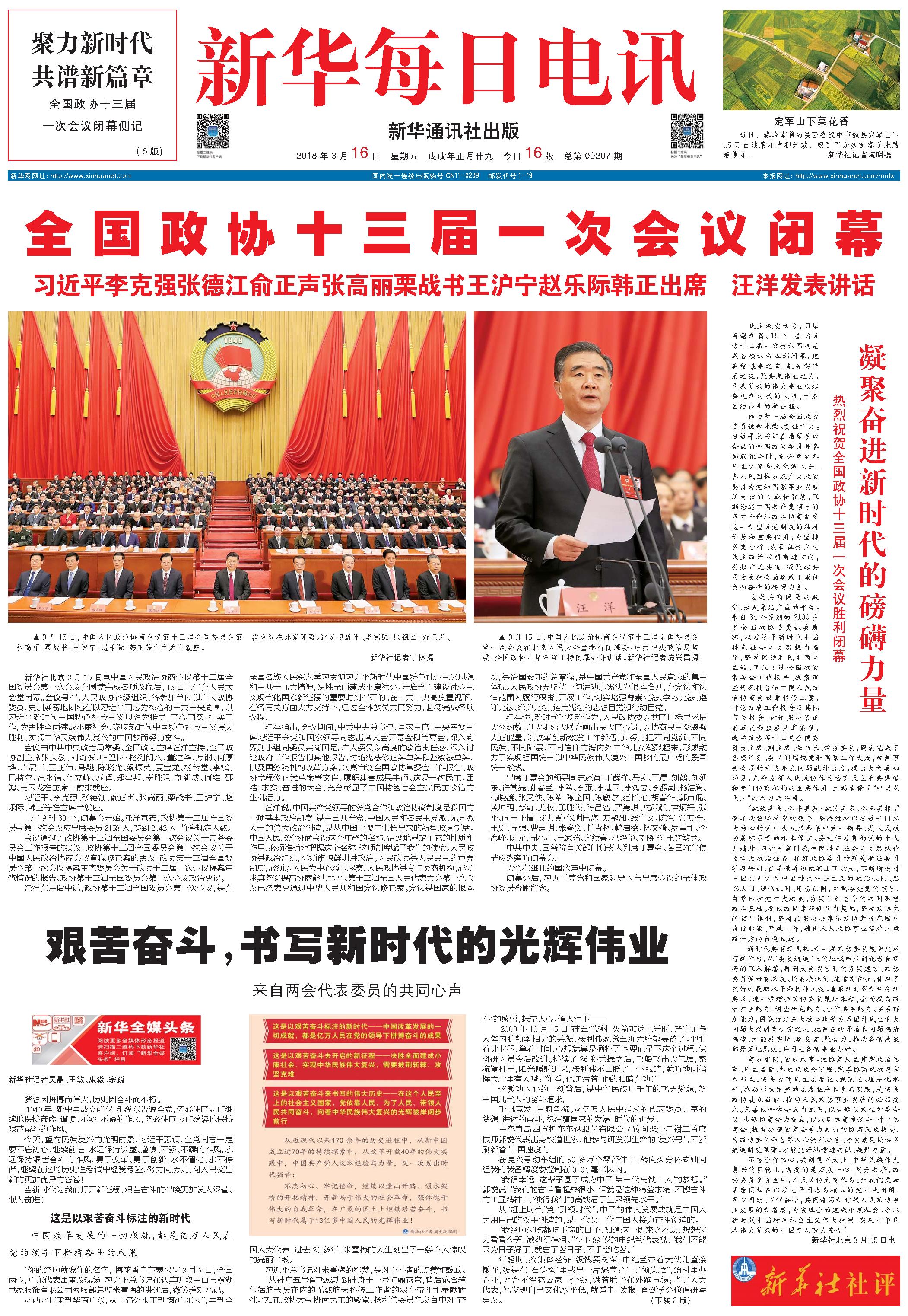 全国政协十三届一次会议闭幕