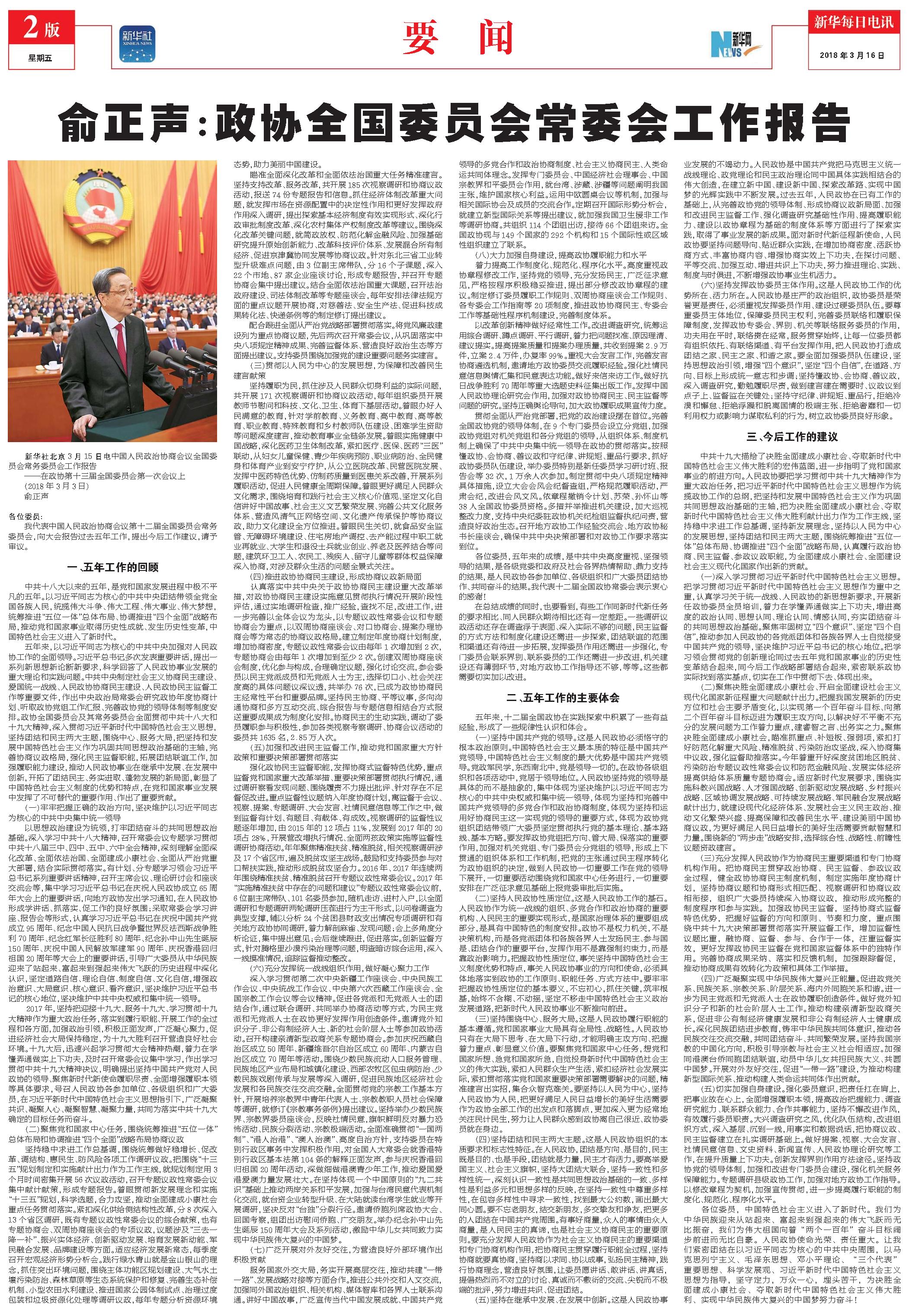 俞正声:政协全国委员会常委会工作报告
