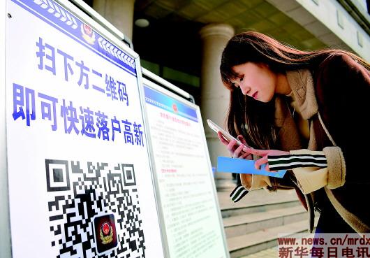 ▲近日,西安外事学院学生周之琳在学校内扫描“西安高新户籍”微信公众号的二维码。