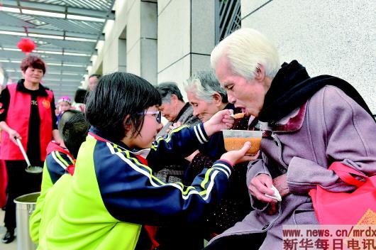 ▲在福州市台江区一处公园,福州亚峰中心小学学生为老人端上象征健康长寿的“拗九粥”。农历正月二十九“拗九节”是福建省福州市极具地方特色的民间传统孝亲节。