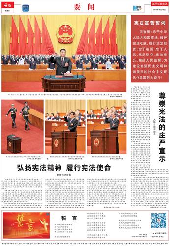 国徽高悬,熠熠生辉;宪法至上,深入人心。首次举行国家领导人宪法宣誓,尤其是习近平同志作为党、国家、军队最高领导人率先垂范,带头面对宪法宣誓,充分彰显了依宪治国、依宪执政的理念,树立了尊崇宪法、遵守宪法、维护宪法的榜样。这次宪法宣誓既是生动的法治实践,也是深刻的宪法教育,有利于在全社会增强宪法意识、树立宪法权威,更好地在新时代弘扬宪法精神,履行宪法使命,不断推进全面依法治国。