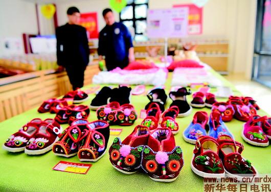 这是扶贫超市销售的周至县南寨子村生产的手工鞋(3月13日摄)。