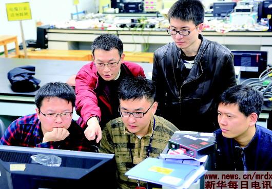 ▲刘萧磊(左二)带领快舟一号甲团队开展仿真试验(2016年11月摄)。